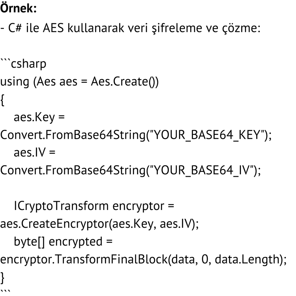AES-256 gibi güçlü algoritmalar kullanılarak kullanıcı verilerinin korunması sağlanabilir. Hassas veriler (örneğin kredi kartı bilgileri) şifrelenerek saklanmalıdır.