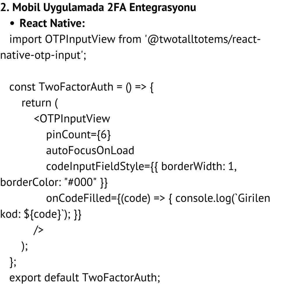 3. React Native'de güvenli local storage için SecureStore veya Keychain gibi çözümler tercih edebilirsiniz.