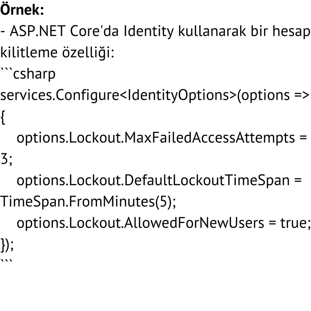 Hatalı kimlik doğrulama girişimlerini sınırlandırmak için bir account lockout mekanizması kullanılabilir. Örneğin: