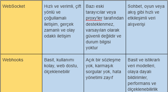 - WebSocket protokolünü veya yükseltme başlığını anlamayan bazı eski tarayıcılar veya proxy'ler tarafından desteklenmez.