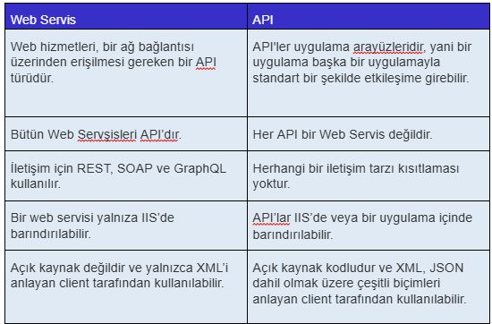 Tüm API'lere internet (ağ) üzerinden erişilemezken, Web servislere her zaman bir ağ üzerinden erişilmelidir. İşte fark bu.