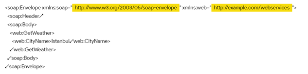 SOAP İstek (Request) Örneği: Aşağıda bir SOAP isteği örneği verilmiştir. Bu örnek, bir hava durumu hizmetine bir şehir adını göndermeyi amaçlar.