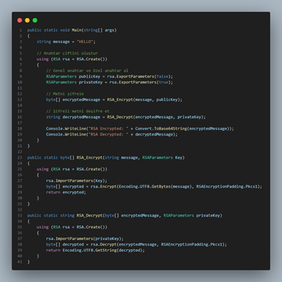 · RSA (Rivest-Shamir-Adleman): RSA, açık anahtarlı şifreleme için en yaygın olarak kullanılan algoritmalardan biridir. İki büyük asal sayının çarpımı olarak oluşturulan bir anahtar çifti kullanır. Genel anahtar ile şifreleme yapılırken, özel anahtar ile deşifre etme işlemi gerçekleştirilir.
